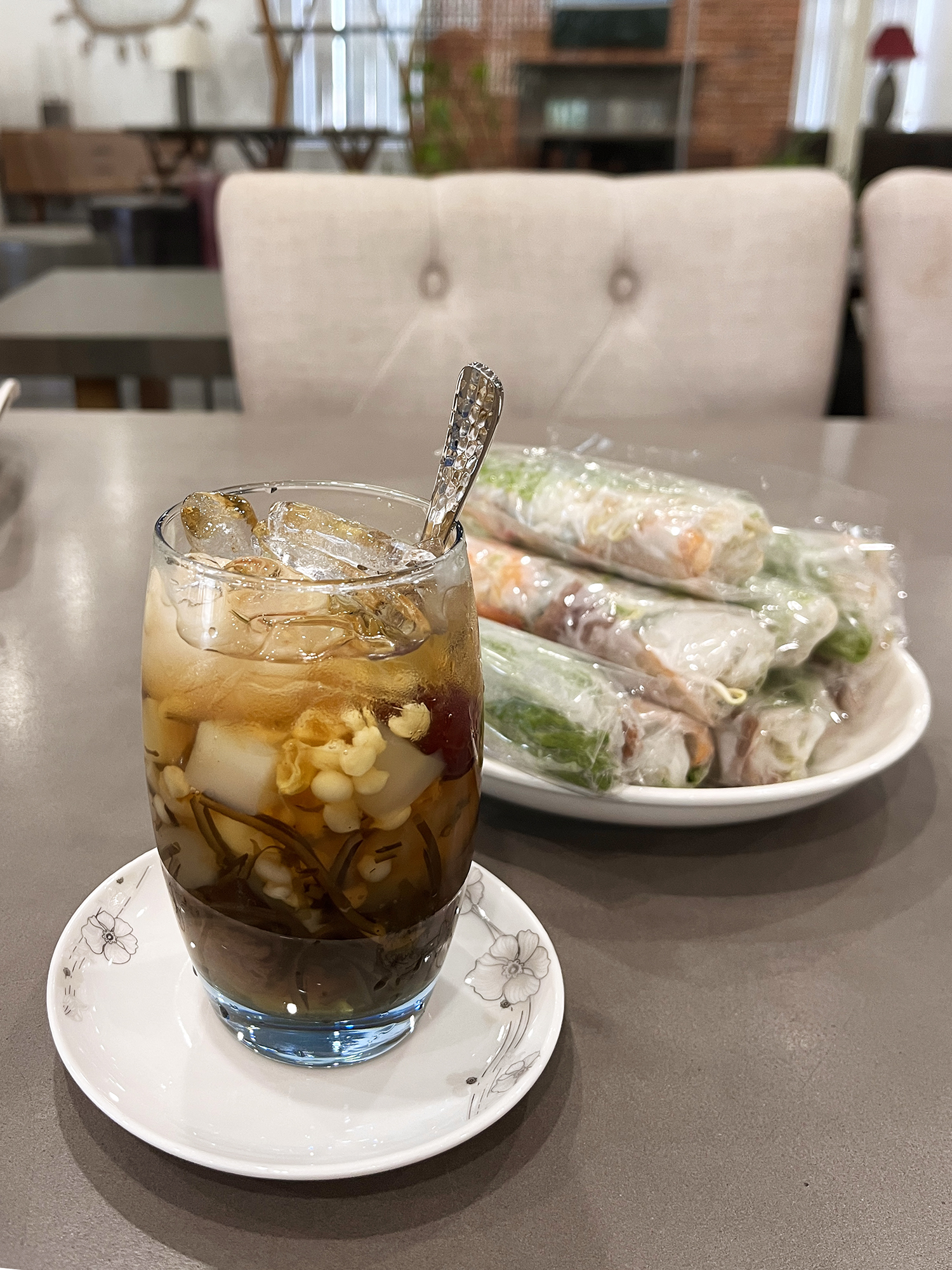 打ち合わせ中のおやつにスイートスープ(チェー che)と生春巻きをいただきました。チェーは初めて食べましたが、色々なフルーツが入っていて美味しいかったです。(昆布らしきものも入っていて微妙ではありましたが。)